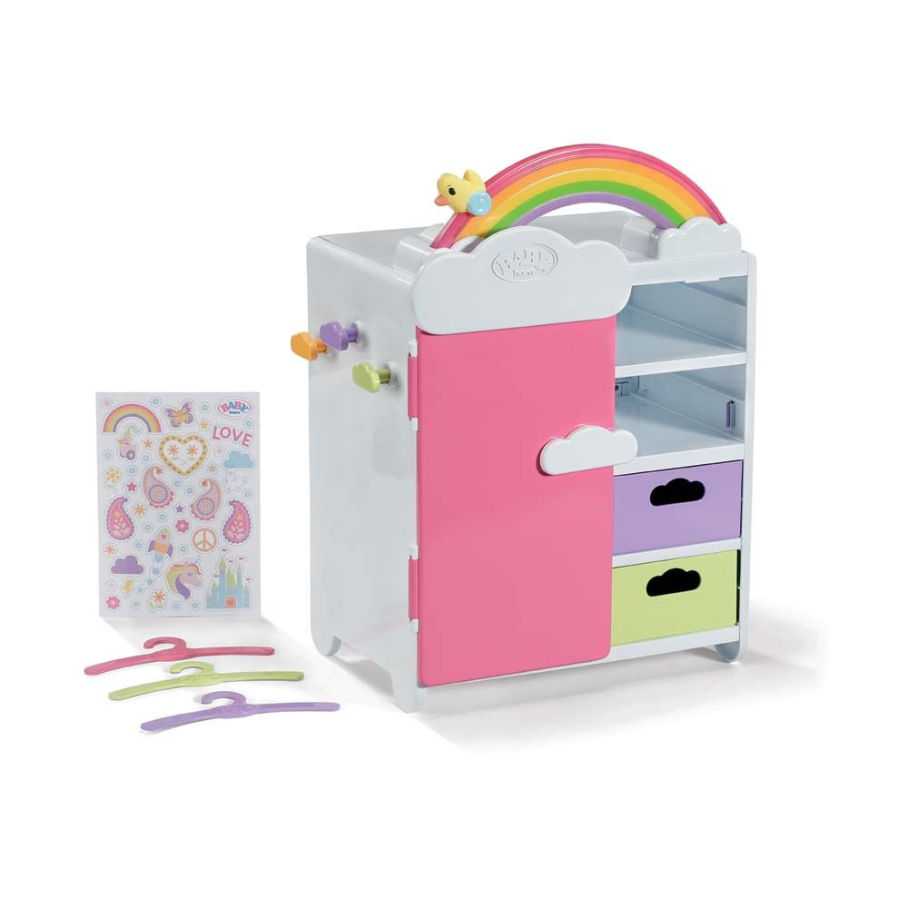 Når Anden Berta skubbes over regnbuen, lyser regnbuen op og Berta spiller en sød melodi. Det gør BABY born i godt humør, når hun vælger dagens outfit fra regnbuegarderobeskabet. Med bøjlestangen, hylderne og de udtagelige skuffer er der masser af plads ti