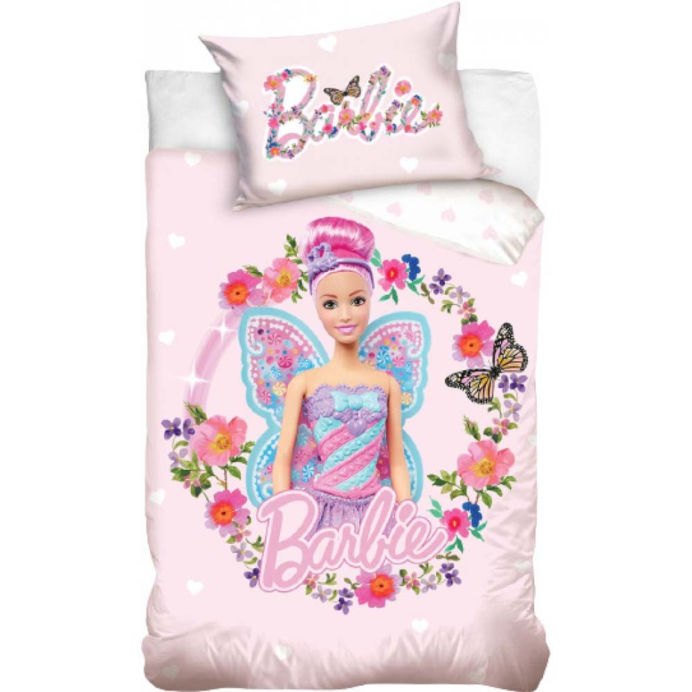 Fint sengetøj med motiv af Barbie. På sengetøjet står Barbie i en krans af blomster og søde sommerfugle på en lyserød baggrund. Sengetøjet er vendbart, så der på den anden side af sengetøjet vises et andet motiv. Betrækket passer til en hovedpude på 40×60