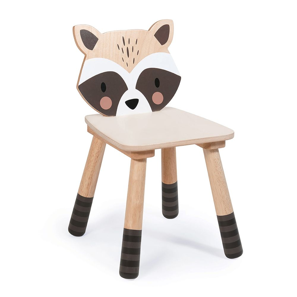 Børnestol i krydsfiner og gummitræ med ryglæn med vaskebjørnillustration.