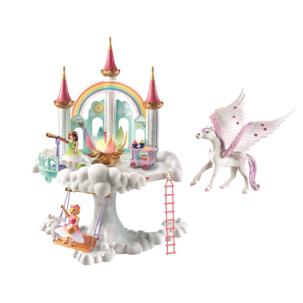 Højt oppe i de bløde skyer finder man regnbueprinsessernes himmelske hjem. Beskyttet af regnbuen og af lyset fra den magisk lysende regnbueblomst* (udtagelig) nyder de livet. Highlights: Pegasus, himmelgynge og prinsesse med fjerlette skynederdele, som ka