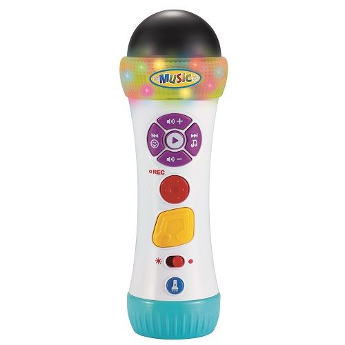 Mikrofonen indeholder 18 melodier, 10 lydeffekter og en indbygget lommelygte, som gør legen ekstra sjov og interaktiv.