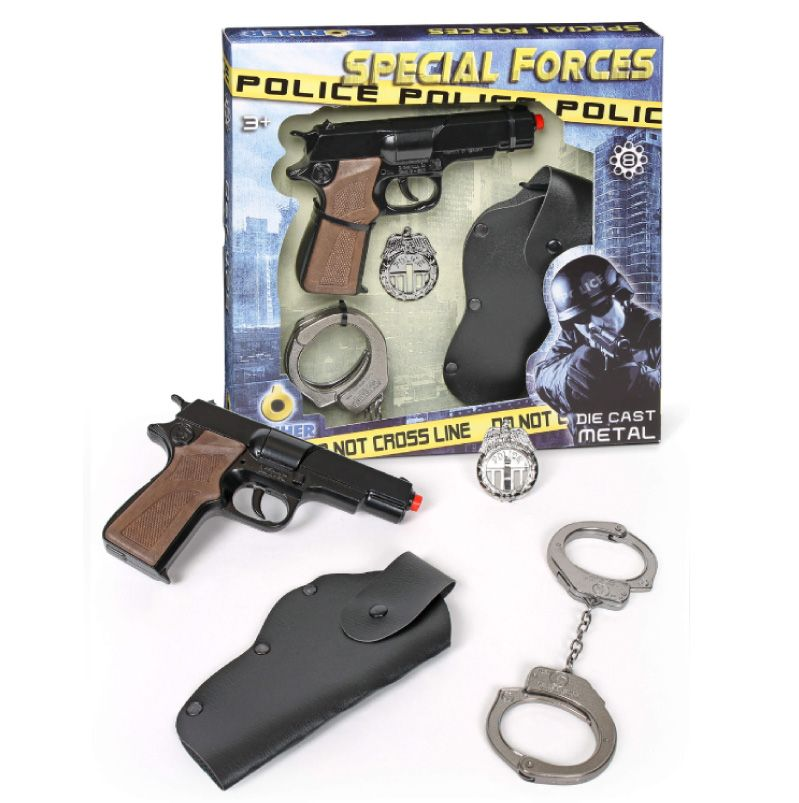 Politisæt bestående af håndjern og metalpistol, politiskilt og hylster.