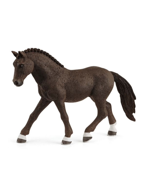 Schleich German Riding Pony Gelding Den tyske ridepony-svejsning har en smukt flettet manke. På trods af sin lave højde ligner han en hest i fuld størrelse. Det er et særligt træk ved denne pony race. Dyrene har lange, slanke ben og en elegant krop.