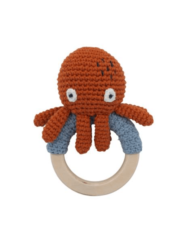 Sebra Hæklet Rangle, Blæksprutten Morgan Rangle på træring med blæksprutten Morgan, har en behagelig klokke inden i, som giver lyd når ranglen rystes. Morgan er fastgjort på en træring, som halvt er dækket af det hæklede materiale.