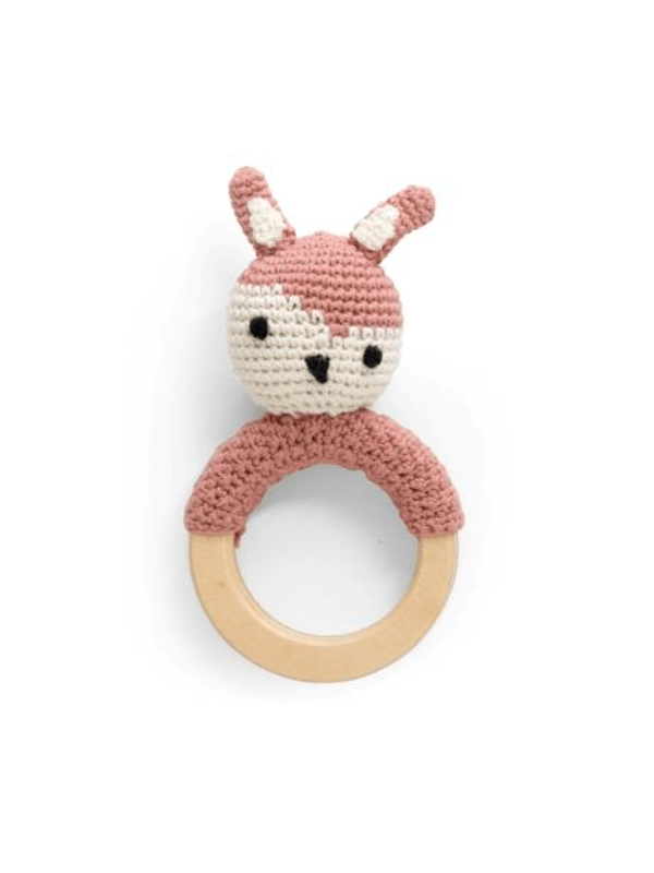 Sebra Hæklet Rangle, Siggy På Træring, Blossom Rangle fra Sebra hæklet i økologisk bomuld og fyld af blødt genanvendt polyester. Fyldet er sikret i en lille stofpose, som forhindrer polyesteren i at finde vej ud gennem garnet.