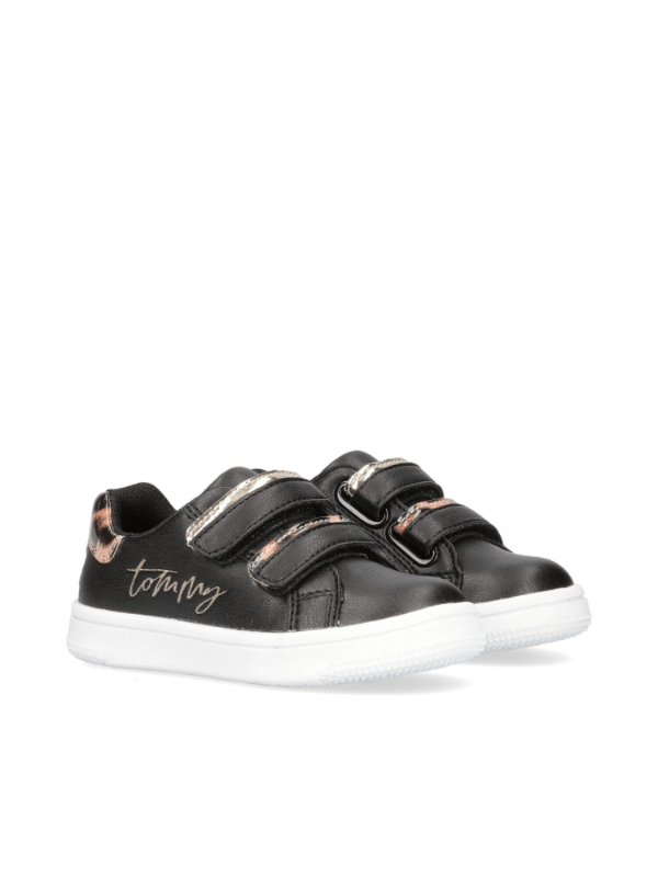 Tommy Hilfiger Sko Leopard Black/Platinum Flotte sneakers fra Tommy Hilfiger til pigerne. Denne sko er sort og har de fineste guld og leopard detaljer. Skoen har to justerbar velcro remme, så den kan tilpasse sig barnets fod.