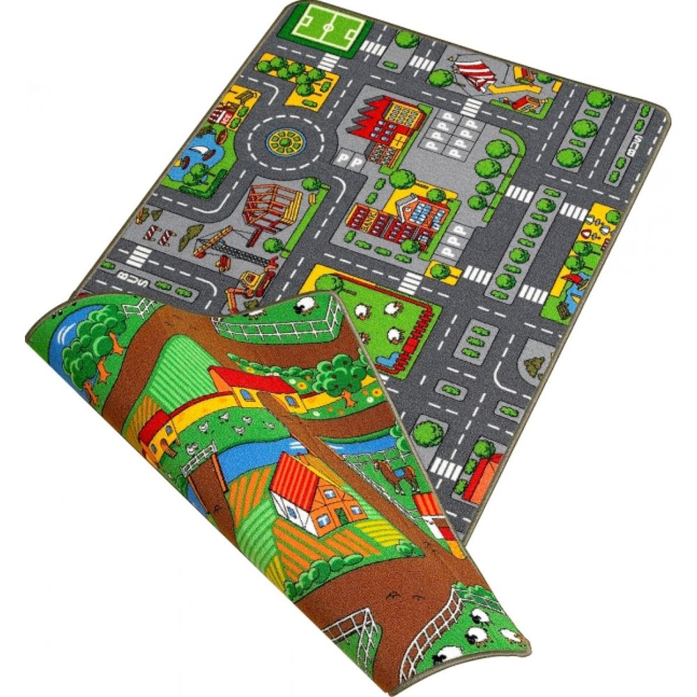 Flot vendbart legetæppe med en hel by med veje, rundkørsel og huse. Trafik legetæppet giver børnene mulighed for at bruge fantasien, når de drøner rundt med legetøjsbilerne på gulvet. Gulvtæppe har både et by-design og et land-tema.