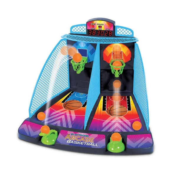 1 basiseenhed, 1 LED-display, 4 hegnsbarrierer, 2 basketballaffyrere, 6 basketballs, 2 baneoverflader, 2 net, 2 bagplader, 1 ark med klistermærker, vejledning.