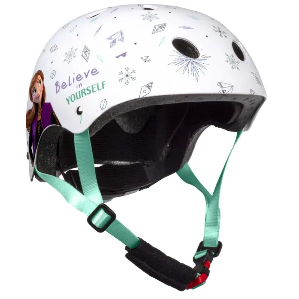 Sportshjelm anbefales altid, mens der cykles, rulles på skøjter eller står på skatboard. Sikkerheden er i top med denne cyklehjelm med motiv af Disney favoritten Frost. Den udvendige del af hjelmen består af en let, slidstærkt ABS-skal, mens hjelmen indve
