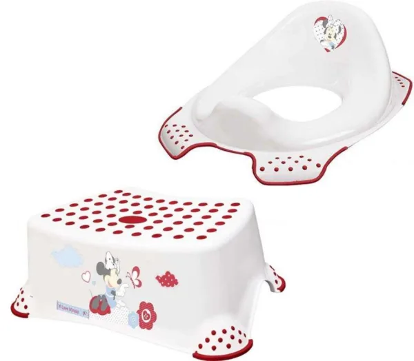 Badeværelsesskammel og toiletsæde med Minnie Mouse.